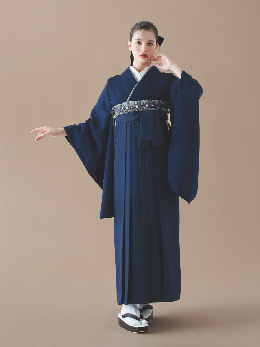 写真のような黒色の着物は、黒やグレー、オフホワイトといった無彩色の袴と合わせると、モードでかっこいい雰囲気に仕上がります。