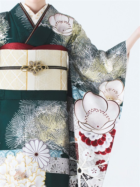 正絹振袖レンタルセット 松華牡丹(深緑)