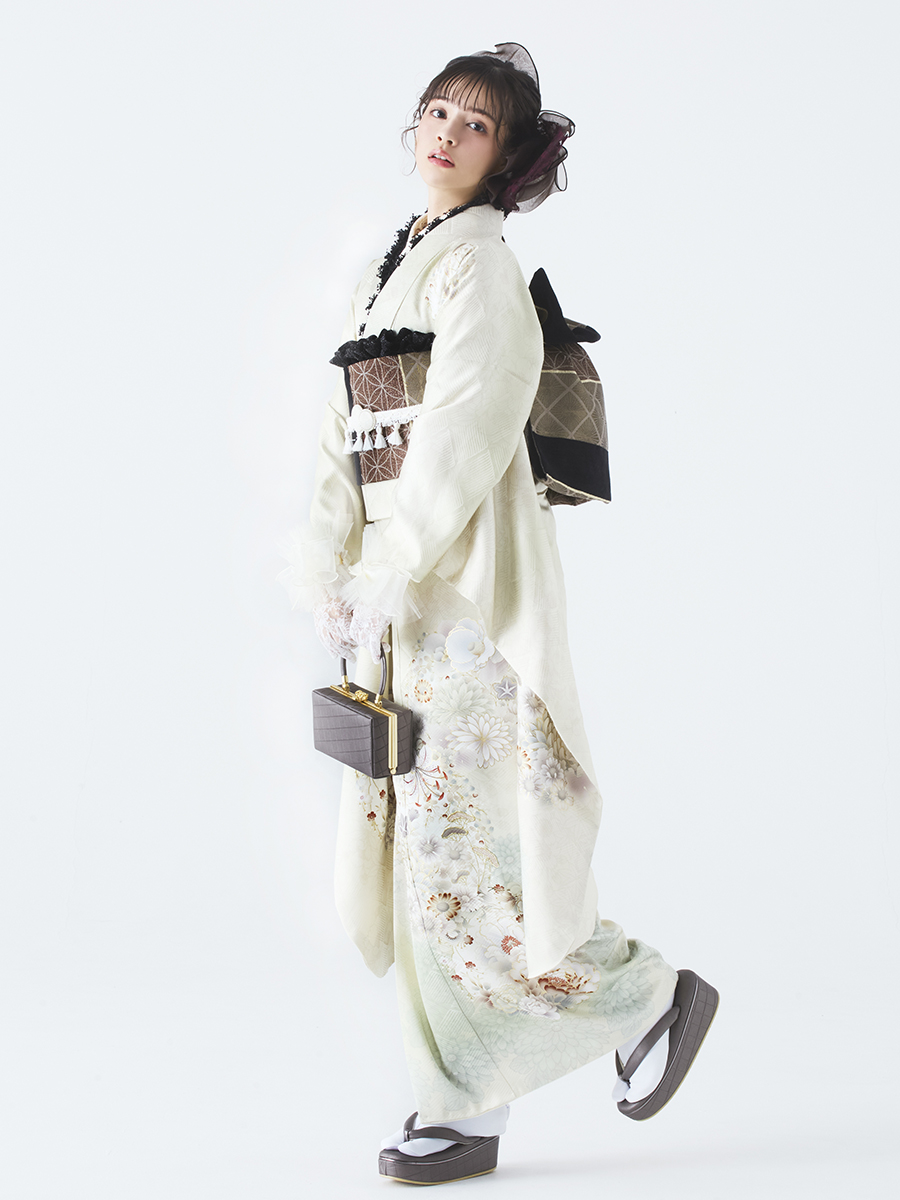 ※足袋は着付け道具セットに含まれます。 ※小物:伊達衿・帯揚げ・帯締めは同色でセットになります。 ※バッグと草履は同色でセットになります。 ※半衿・伊達衿についてはモデル着用のものとは異なる場合がございます。 ※モデル着用の半衿・バッグ・草履等には、セットに含まれていない別売りのものもございます。 髪飾りは別売りです。予めご了承ください。